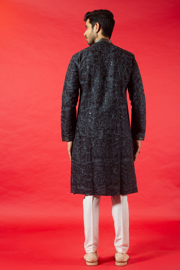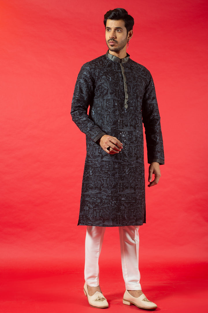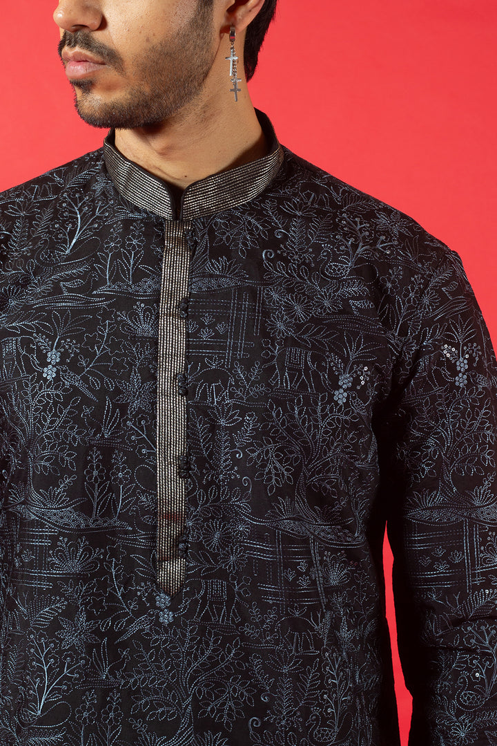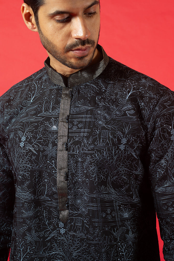 BLACK SILK KURTA SET WITH RESHAM EMBROIDERY