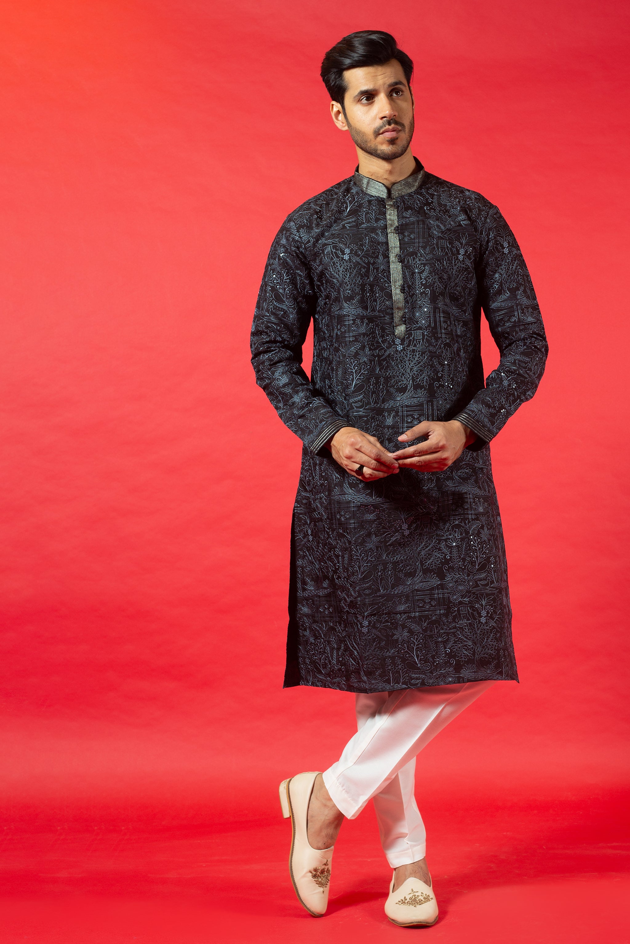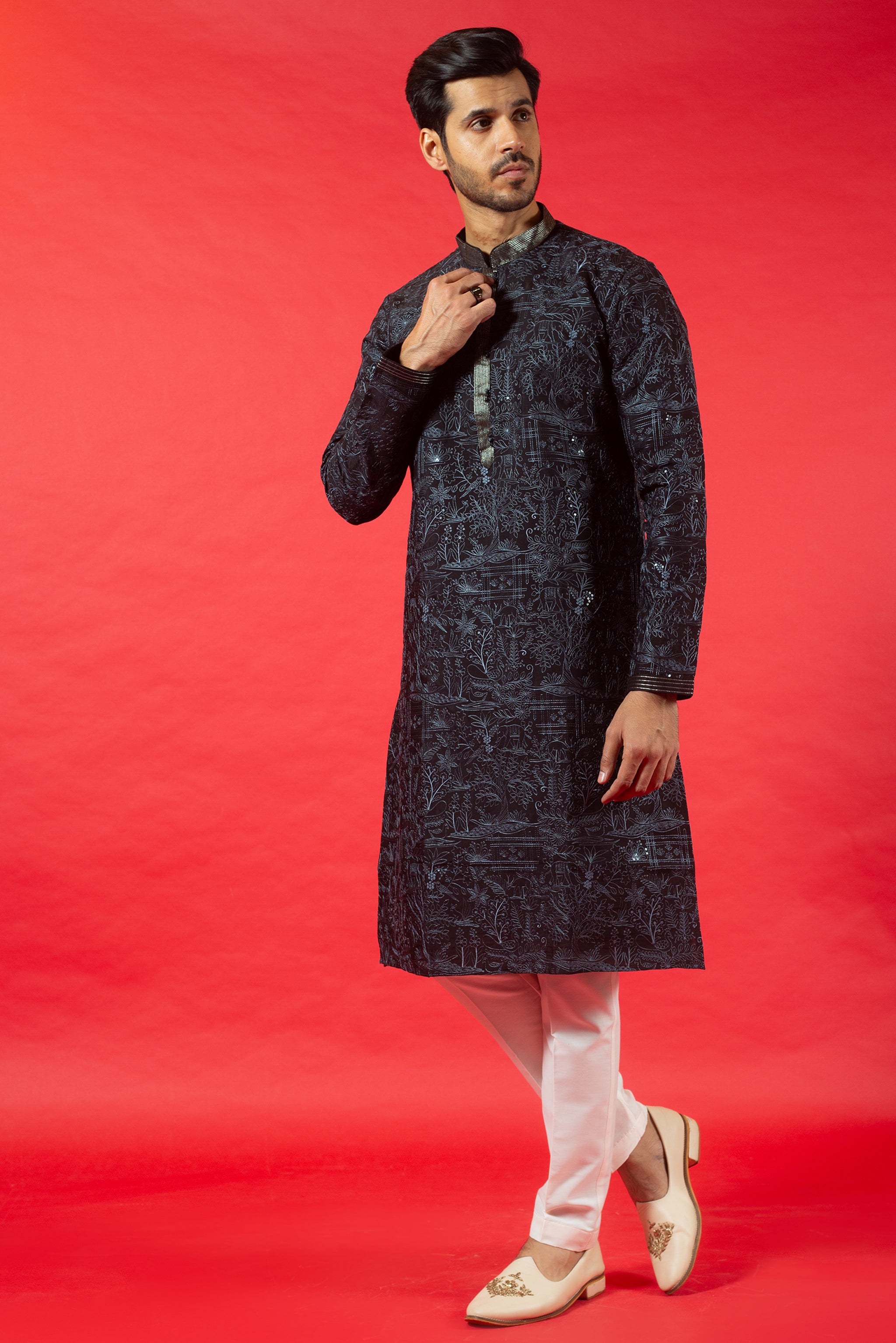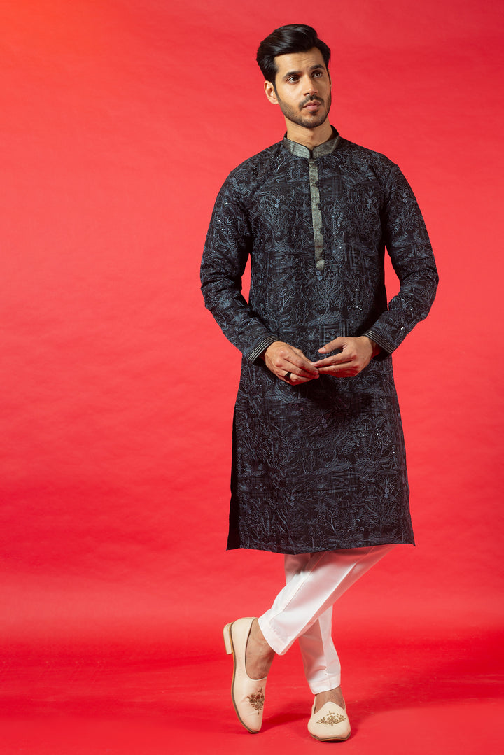 BLACK SILK KURTA SET WITH RESHAM EMBROIDERY