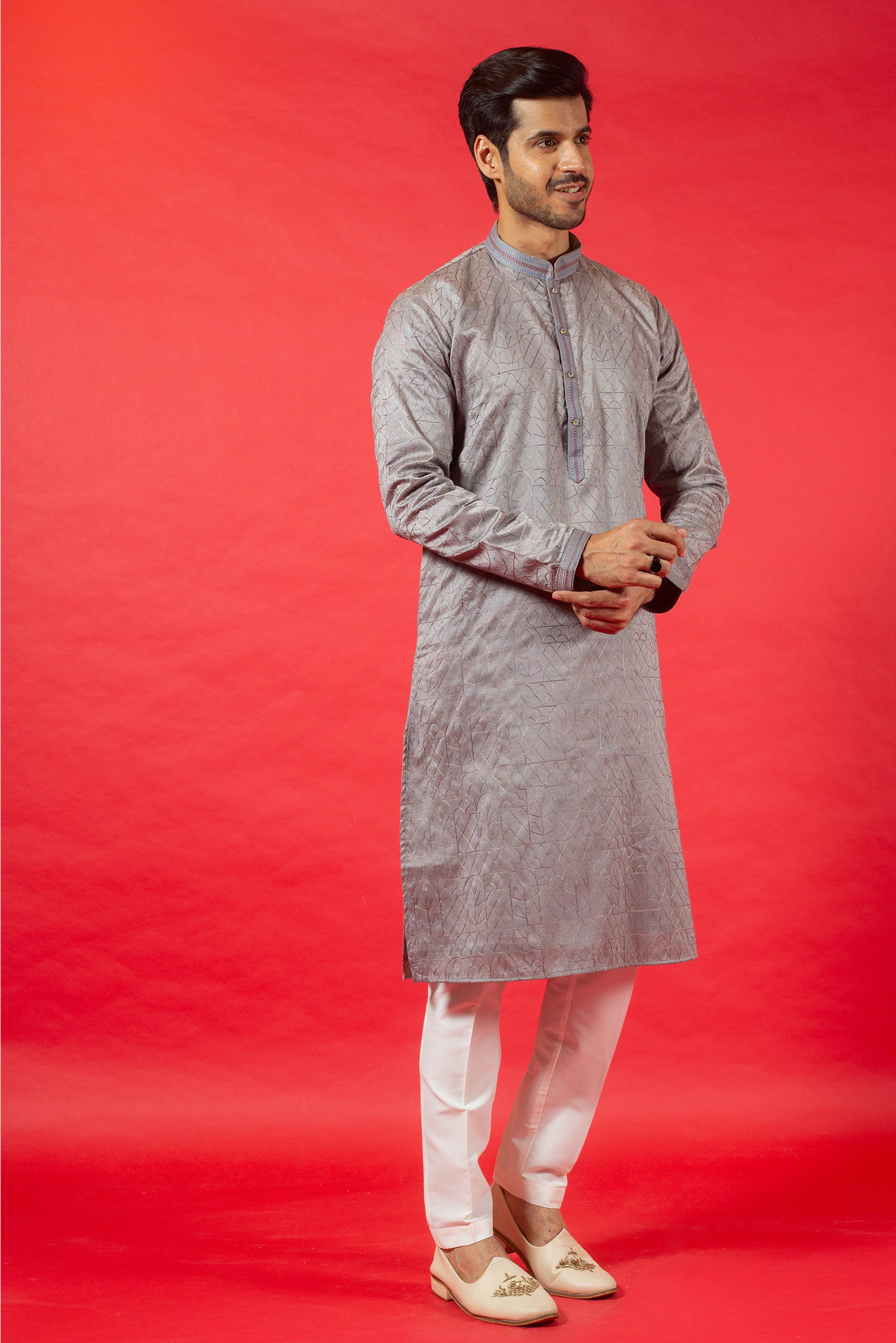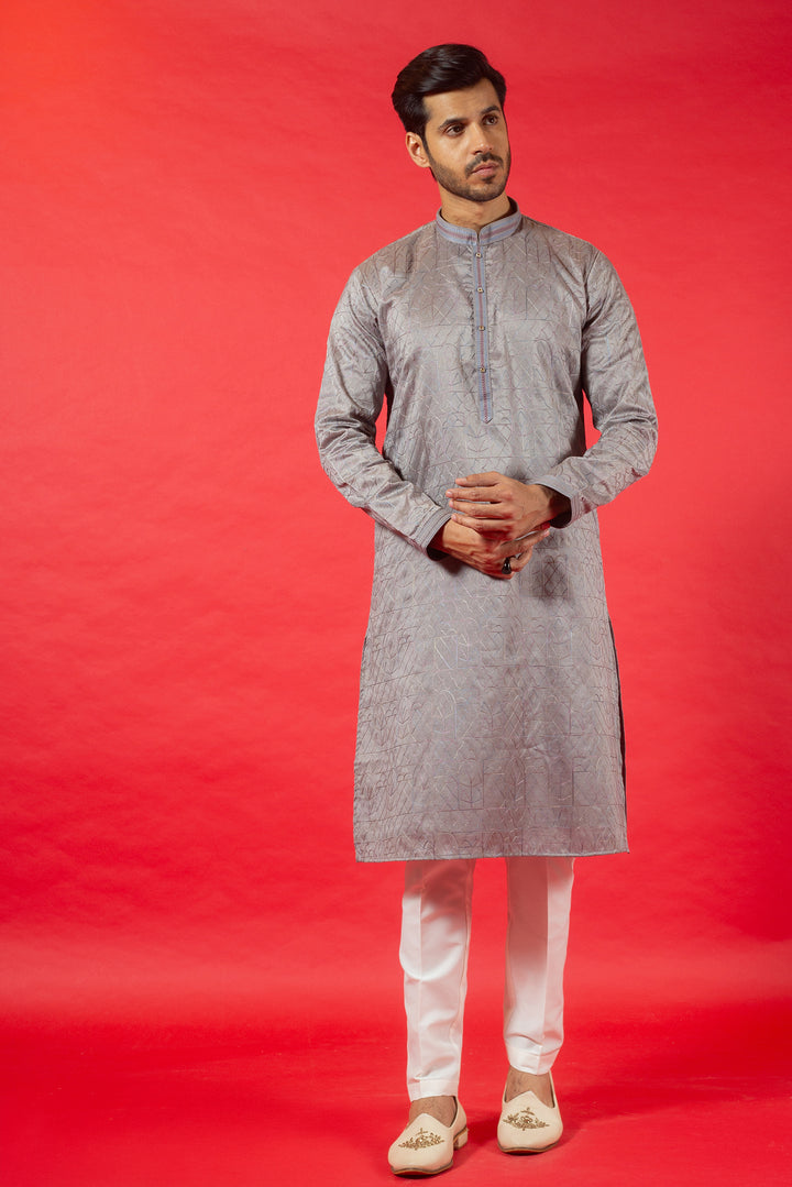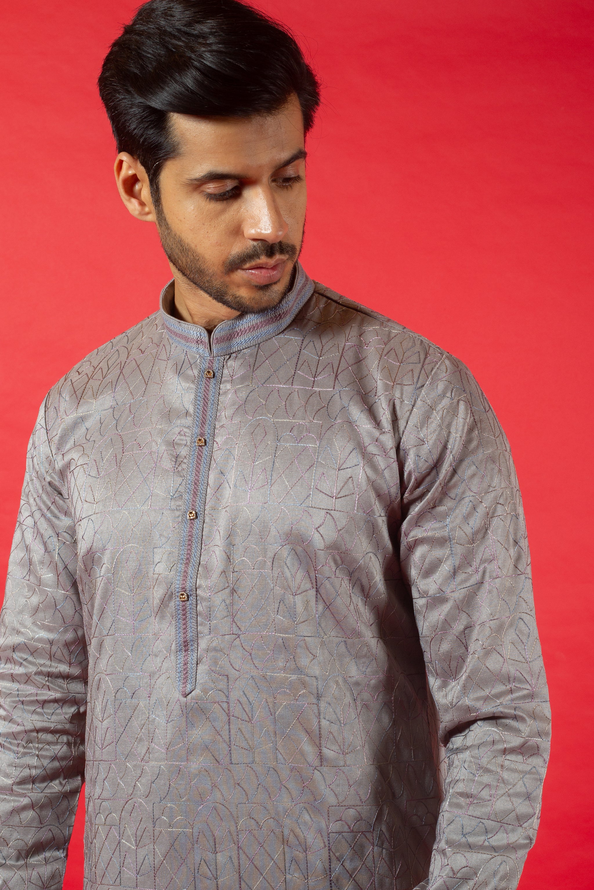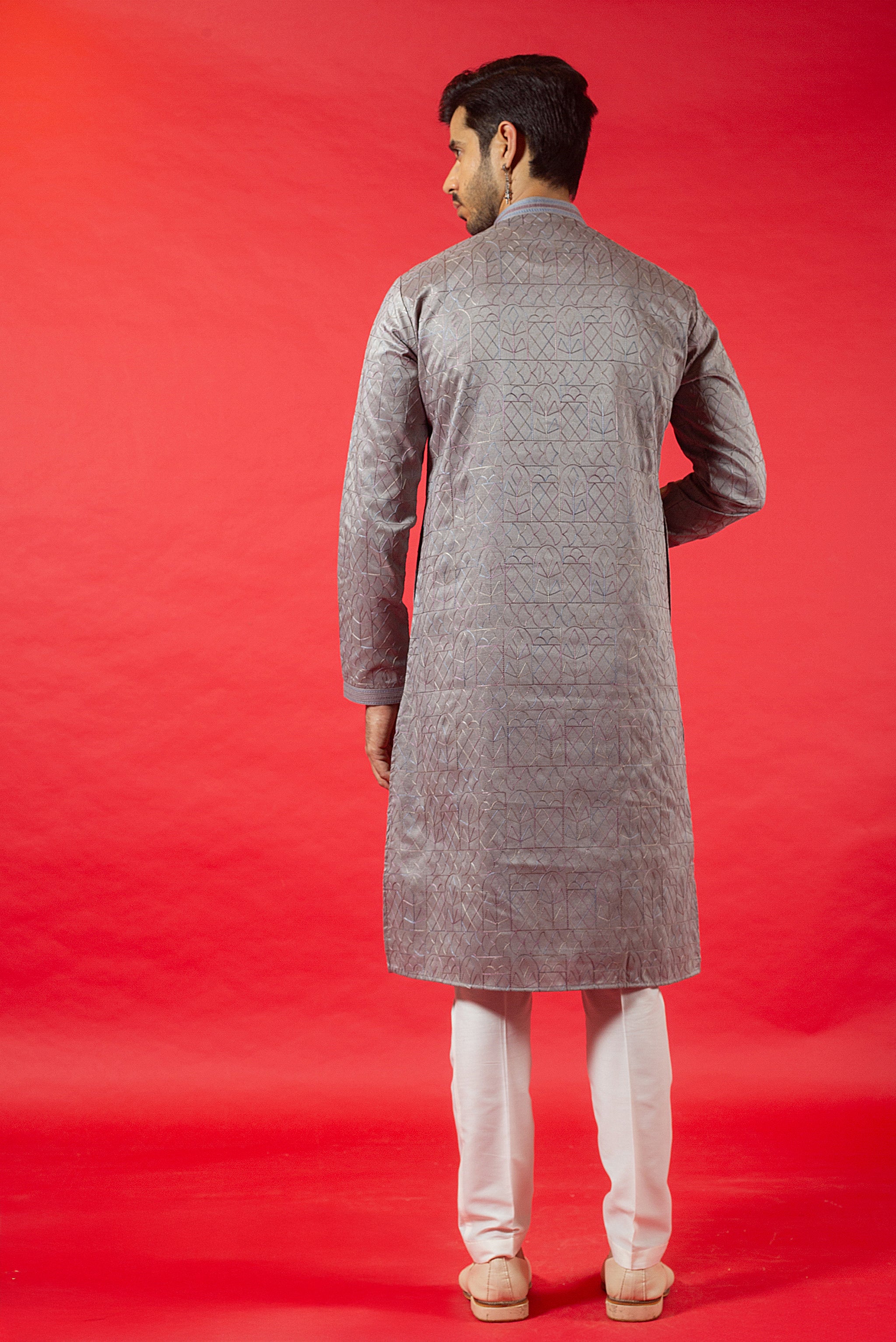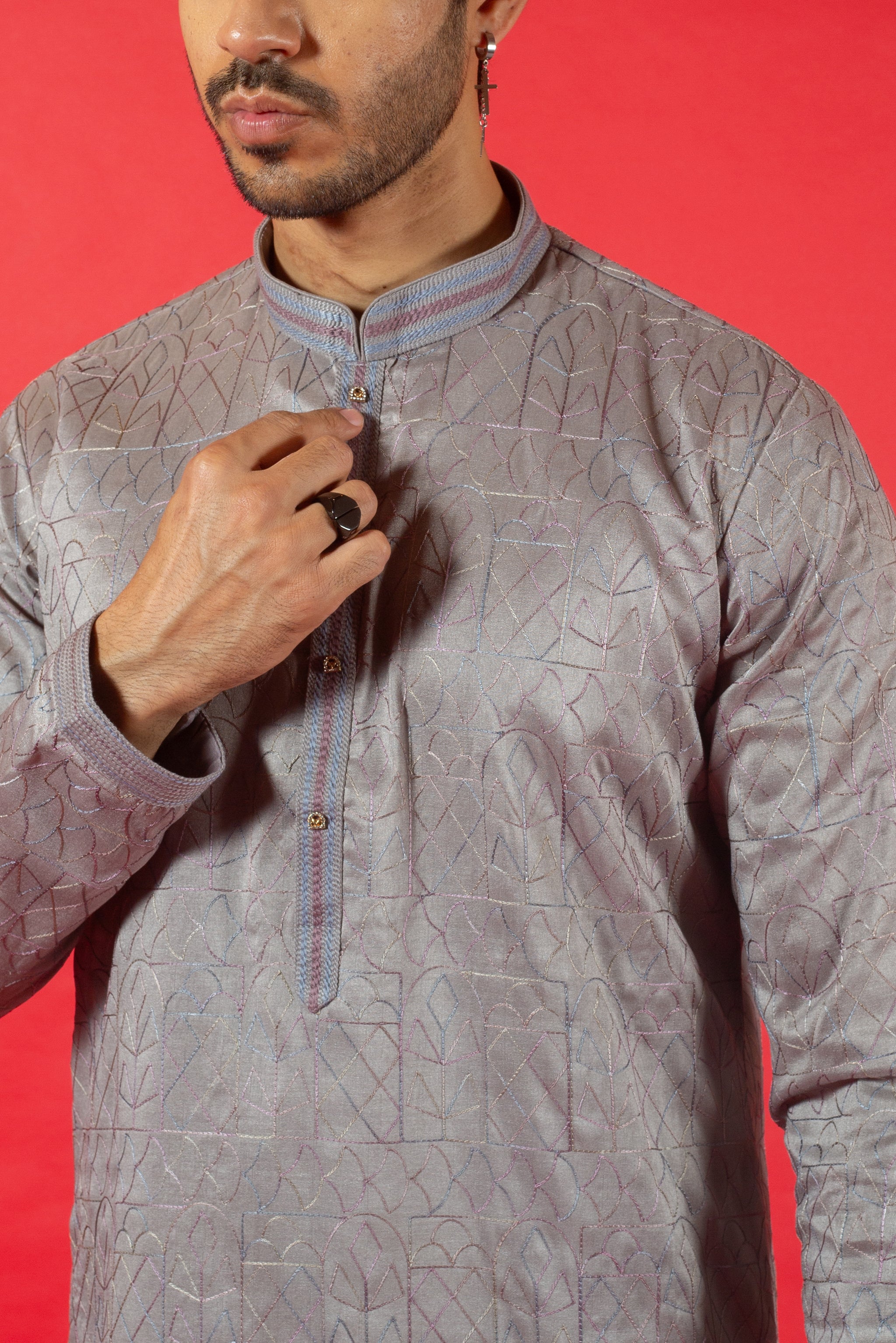 GREY SILK KURTA SET WITH MULTICOLOUR RESHAM EMBROIDERY